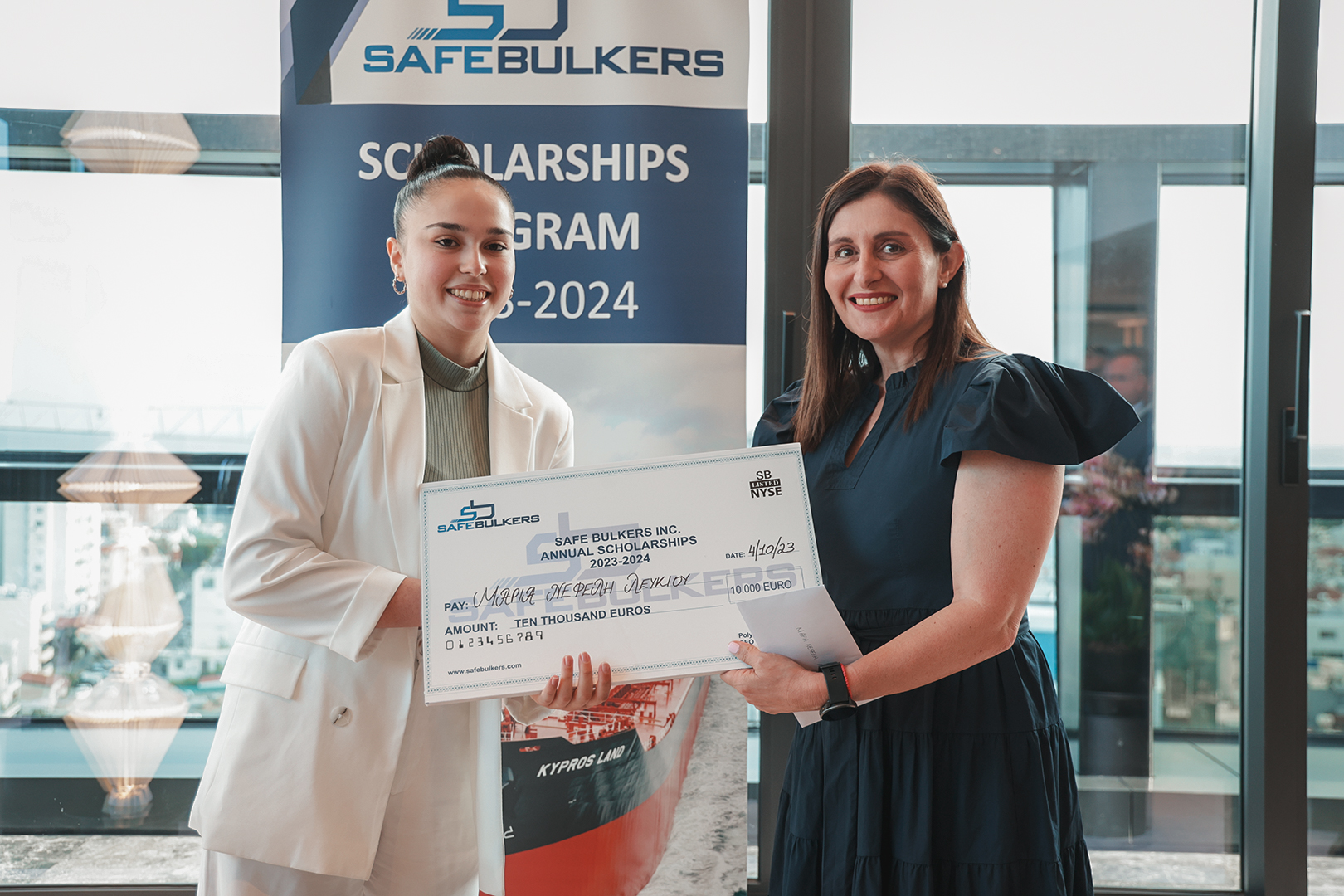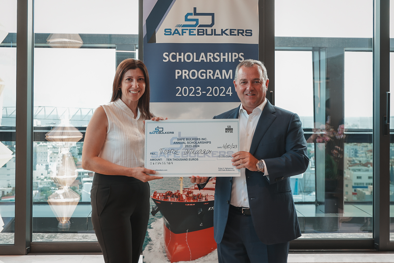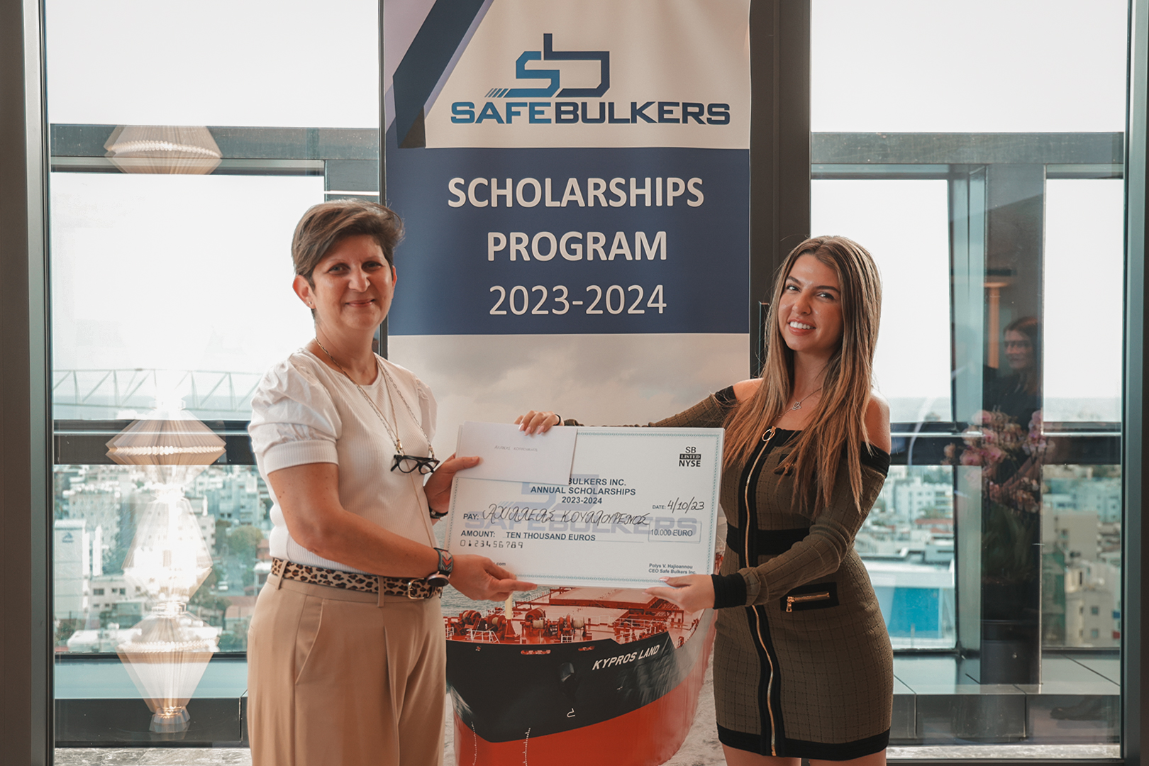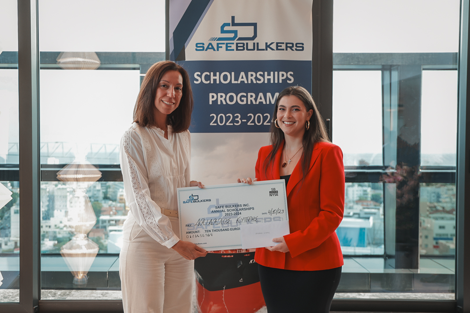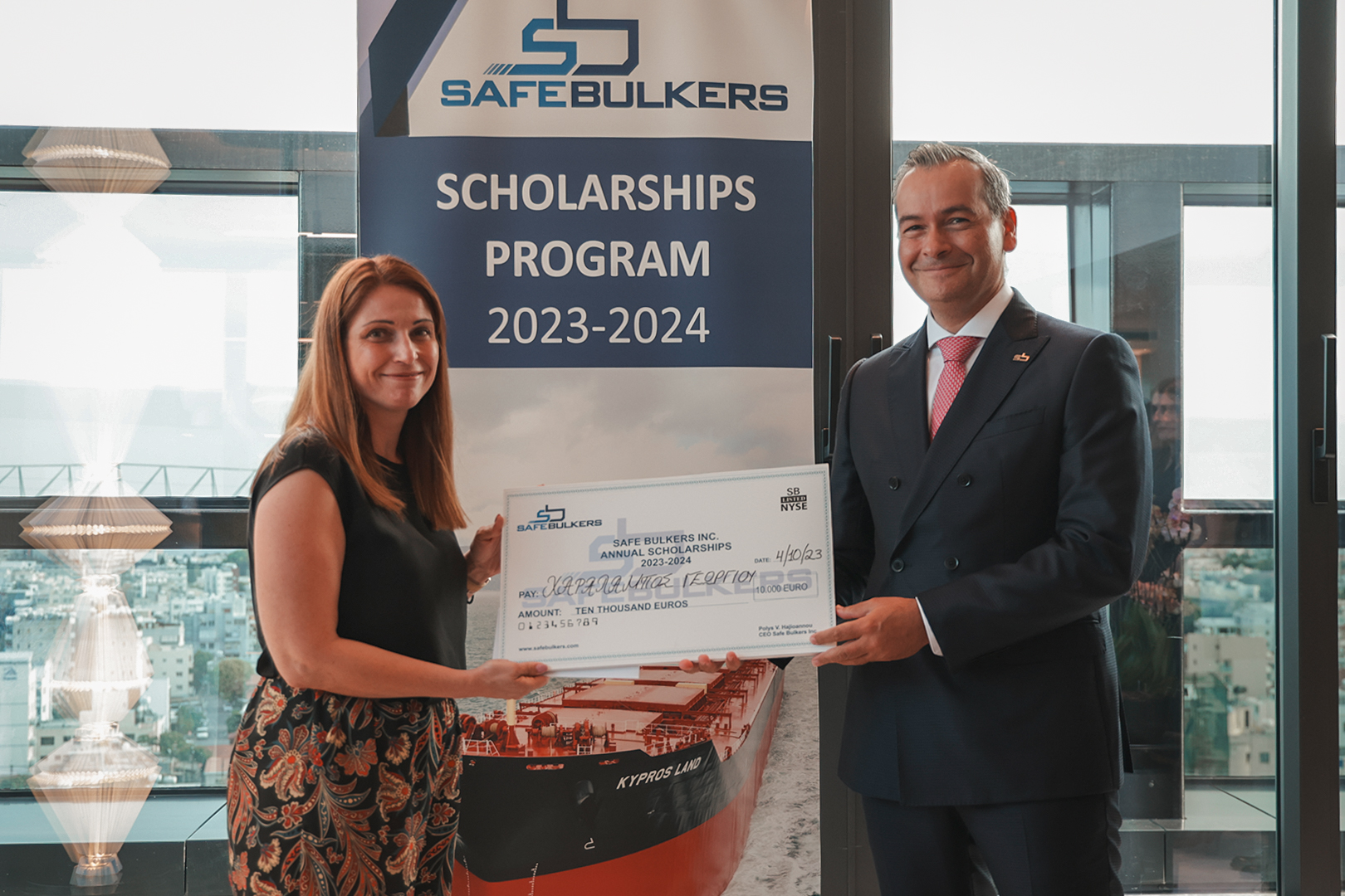 Η Safe Bulkers, Inc και ο Διευθύνων Σύμβουλός της, κ. Πόλυς Β. Χατζηωάννου, συνεχίζουν με συνέπεια για τρίτη συνεχόμενη χρονιά το ετήσιο πρόγραμμα υποτροφιών για Κύπριους πολίτες ή Έλληνες πολίτες εγκατεστημένους στην Κύπρο, που επιθυμούν να σταδιοδρομήσουν στον κλάδο της ναυτιλίας. Η εκδήλωση απονομής των υποτροφιών της Safe Bulkers, Inc. πραγματοποιήθηκε στις 4 Οκτωβρίου 2023, στα κεντρικά γραφεία της Εταιρείας στη Λεμεσό.