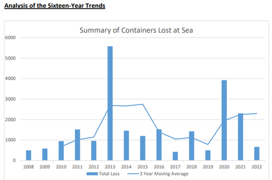 Συνολικά 661 κοντέινερ χάθηκαν στη θάλασσα το 2022, από τα 250 εκατ. που μεταφέρθηκαν. Αυτό αντιπροσωπεύει τις χαμηλότερες απώλειες επί τοις εκατό από την έναρξη της έρευνας το 2008. Οι βελτιωμένοι αριθμοί συνιστούν θετικά νέα, αλλά δεν υπάρχει χρόνος για εφησυχασμό και θα πρέπει να συνεχιστούν οι προσπάθειες για να μειωθεί ο αριθμός των εμπορευματοκιβωτίων που χάνονται στη θάλασσα. Στο σημείο αυτό πρέπει να αναφερθεί ότι η απώλεια των εμπορευματοκιβωτίων, εκτός από οικονομική ζημιά, αποτελεί και μεγάλο ναυτιλιακό κίνδυνο, αν ληφθεί υπόψη ότι είναι βυθισμένα κατά τα δύο τρίτα στο νερό, δεν έχουν ηχώ στις οθόνες ραντάρ των πλοίων, με αποτέλεσμα τη νύχτα μια πρόσκρουση πλοίου με το παρασυρόμενο εμπορευματοκιβώτιο να προκαλέσει αρκετά μεγάλη ζημιά στο πλοίο, και αν αυτό είναι αλιευτικό, μπορεί να είναι μοιραία.