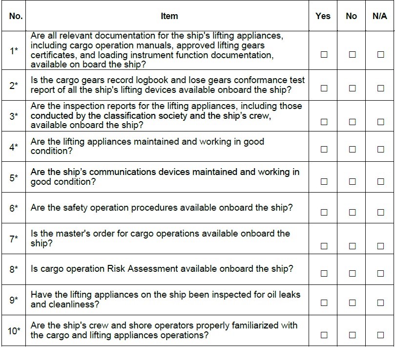 Οι επιθεωρητές του κράτους λιμένα (PSCOs) θα χρησιμοποιούν μια λίστα 10 ερωτήσεων για να αξιολογούν την επάρκεια και τη συμμόρφωση των ανυψωτικών μηχανημάτων και του εξοπλισμού των πλοίων με τις σχετικές απαιτήσεις, να διασφαλίζουν ότι ο πλοίαρχος και τα μέλη του πληρώματος είναι εξοικειωμένα με τις λειτουργίες που αφορούν αυτές τις συσκευές και να επαληθεύουν ότι ο εξοπλισμός συντηρείται και λειτουργεί σωστά.