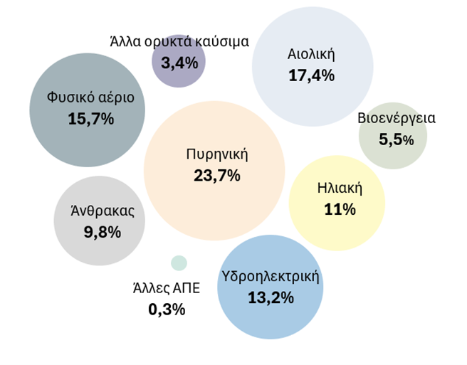 Ειδικότερα, είναι ενθαρρυντική η παρουσία των ανανεώσιμων πηγών ενέργειας, όπως η αιολική (17,4%), η υδροηλεκτρική (13,2%) και η ηλιακή (11%), οι οποίες κατέχουν αξιοσημείωτο μερίδιο. Παρ’ όλα αυτά, ο άνθρακας (9,8%), το φυσικό αέριο (15,7%) και τα άλλα ορυκτά καύσιμα (3,4%) εξακολουθούν να συμμετέχουν δυναμικά στην ηλεκτροπαραγωγή της ΕΕ, δείχνοντας ότι υπάρχει ακόμη δρόμος για πλήρη απεξάρτηση από αυτά. Σε κάθε περίπτωση, η μετάβαση από τα ορυκτά καύσιμα σε καθαρές πηγές ενέργειας είναι απαραίτητη για τη βιώσιμη ανάπτυξη του πλανήτη και την επίτευξη των παγκόσμιων στόχων για το κλίμα.