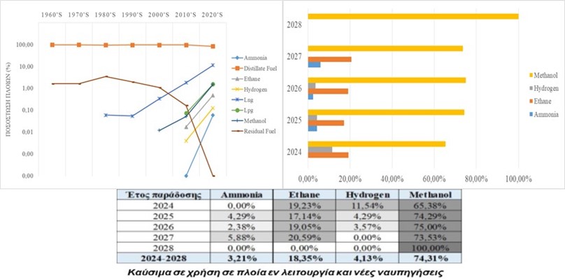 Επί του παρόντος, σε πλοία με χρονολογία ναυπήγησης από το 1960 έως το 2028 (αναμενόμενη), παρατηρείται χρήση Ελαφρότερων Κλασμάτων Πετρελαίου με ελαφριά τάση μείωσης την τελευταία δεκαετία, Βαρύτερων Κλασμάτων Πετρελαίου με τάση εγκατάλειψης την τελευταία δεκαετία. Τάση αύξησης χρήσης φαίνεται στα LNG, LPG, αιθάνιο και υδρογόνο, ενώ μεγαλύτερη τάση αύξησης φαίνεται στη μεθανόλη και στην αμμωνία. Ιδιαίτερο ενδιαφέρον παρουσιάζουν οι νέες ναυπηγήσεις, όπου σχεδόν τα ¾ αφορούν πλοία που θα κινούνται με μεθανόλη.