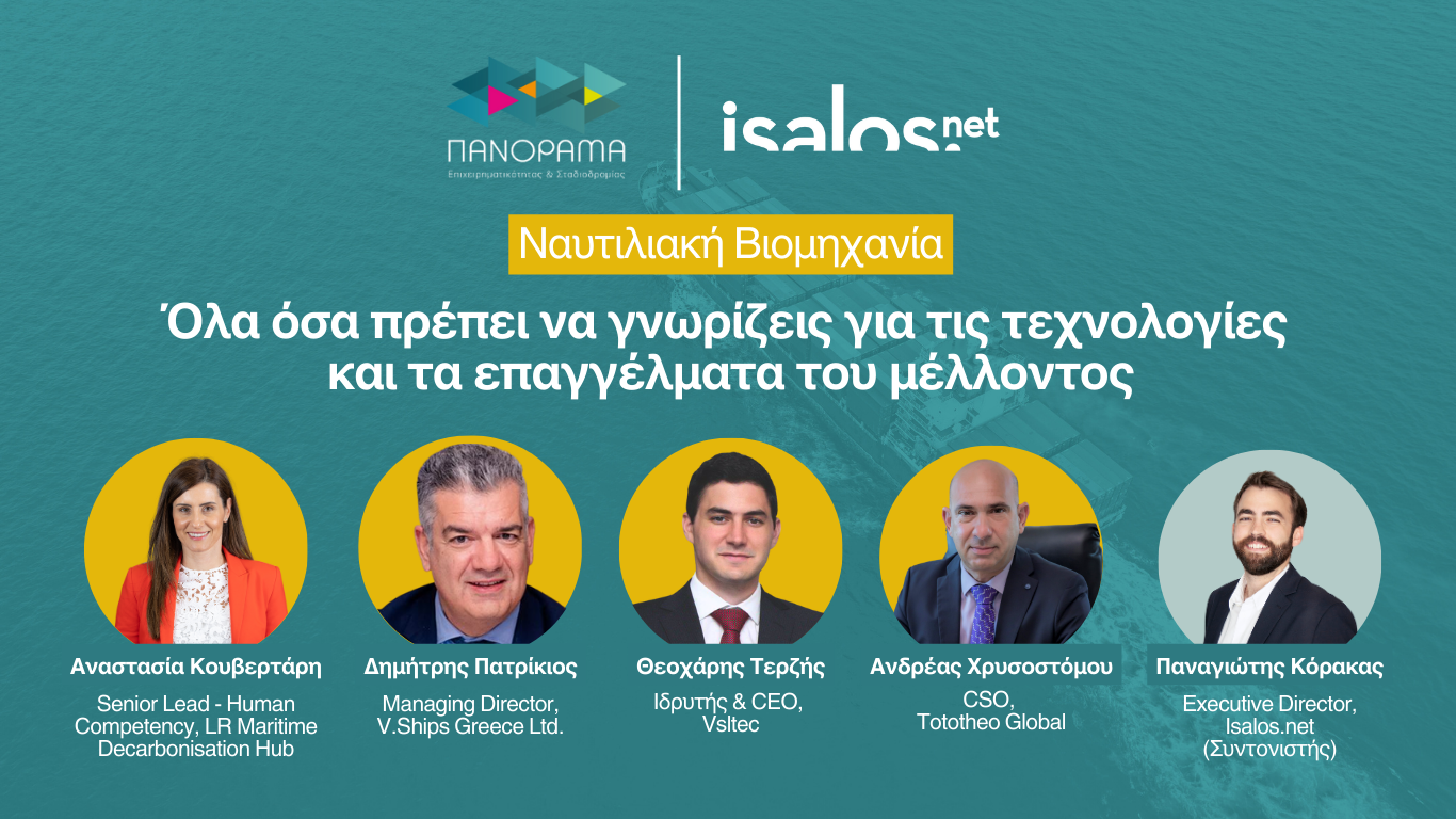 Η Isalos.net, στο πλαίσιο του 15ου Πανοράματος Επιχειρηματικότητας και Σταδιοδρομίας, διοργανώνει τη συζήτηση στρογγυλής τραπέζης με τίτλο «Ναυτιλιακή Βιομηχανία: Όλα όσα πρέπει να γνωρίζεις για τις τεχνολογίες και τα επαγγέλματα του μέλλοντος».