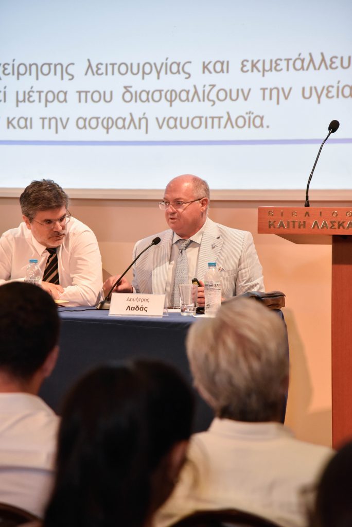 Σε ό,τι αφορά τις εισηγήσεις των ομιλητών, η εκδήλωση εκκίνησε με παρουσίαση του κ. Δημήτρη Λαδά (Αν. Καθηγητή Νομικής ΕΚΠΑ) με τίτλο «Ζητήματα ασφάλειας της υγείας και του προσώπου του ναυτικού». Ο κ. Λαδάς επικεντρώθηκε στις σημαντικότερες ρυθμίσεις που αφορούν την υγεία και την ασφάλεια στη ναυτική εργασία, αναφερόμενος στις «υποχρεώσεις της πολιτείας και του εργοδότη». Ταυτόχρονα, έκανε λόγο για ειδικές προστατευτικές διατάξεις για την υγεία και την ασφάλεια κατά την εργασία των ναυτικών εν πλω, οι οποίοι είναι εργαζόμενοι που παρέχουν την εργασία τους υπό ιδιαίτερες συνθήκες. Όπως διατυπώθηκε, η εξασφάλιση της υγείας και της ασφάλειας για τον ναυτικό, σε συνδυασμό με την εκπαίδευσή του, μπορούν να εξασφαλίσουν όχι μόνο την ασφαλή ναυσιπλοΐα αλλά και την προστασία του περιβάλλοντος. Τέλος, ο διακεκριμένος εργατολόγος δεν παρέλειψε να αναφερθεί στη σύνθετη πραγματικότητα και στις ιδιαίτερες συνθήκες ζωής των ναυτικών πάνω στο πλοίο, παράγοντες που επηρεάζουν τη φυσική τους κατάσταση αλλά και την ψυχική τους υγεία.
