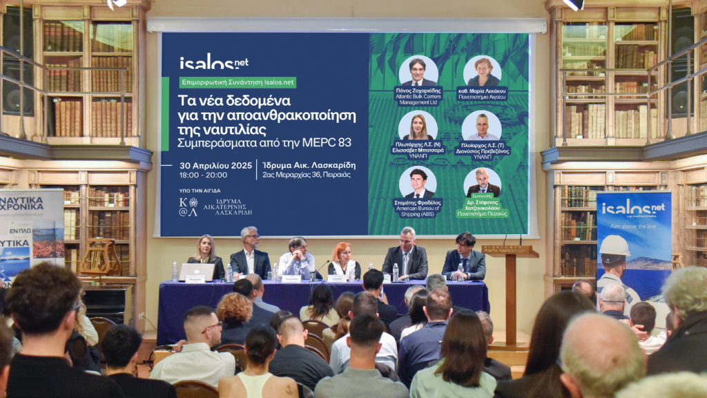 Με αφορμή τη φετινή ολοκλήρωση των εργασιών της 83ης συνεδρίασης της Marine Environment Protection Committee (MEPC) και τα μεσοπρόθεσμα μέτρα που ανακοίνωσε ο IMO για τη μείωση των εκπομπών αερίων του θερμοκηπίου από τα εμπορικά πλοία, η Isalos.net διοργάνωσε μια ακόμα επιμορφωτική εκδήλωση αυτή τη φορά με τίτλο «MEPC 83: Τα νέα δεδομένα για την αποανθρακοποίηση της ναυτιλίας», η οποία έλαβε χώρα την Τετάρτη 30 Απριλίου 2025 στην Ιστορική Βιβλιοθήκη του Ιδρύματος Αικ. Λασκαρίδη στον Πειραιά. Στο πλαίσιο της εκδήλωσης, πραγματοποιήθηκε μία συζήτηση στρογγυλής τραπέζης, η οποία επικεντρώθηκε στην χαρτογράφηση του νέου τοπίου στη ναυτιλιακή βιομηχανία, όπως αυτό διαμορφώθηκε με την ανακοίνωση των νέων μέτρων από τον IMO.