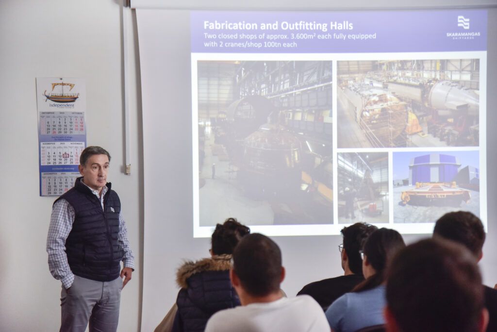 Η επίσκεψη της Isalos.net στα Ναυπηγεία Σκαραμαγκά ξεκίνησε με μια εταιρική παρουσίαση της Skaramangas Shipyards, ενώ παράλληλα την επίσκεψη τίμησαν με την παρουσία τους εκπρόσωποι της διοίκησης των ναυπηγείων. Πιο συγκεκριμένα, κατά τη διάρκεια της παρουσίασης, το κοινό της Isalos.net είχε την ευκαιρία να ακούσει χαιρετισμό από τον Διευθύνοντα Σύμβουλο των Ναυπηγείων Σκαραμαγκά, κ. Μιλτιάδη Βαρβιτσιώτη, ο οποίος αναφέρθηκε μεταξύ άλλων στη σημασία των Ναυπηγείων Σκαραμαγκά στην Ανατολική Μεσόγειο, αλλά και στους στρατηγικούς στόχους των Ναυπηγείων για το μέλλον.