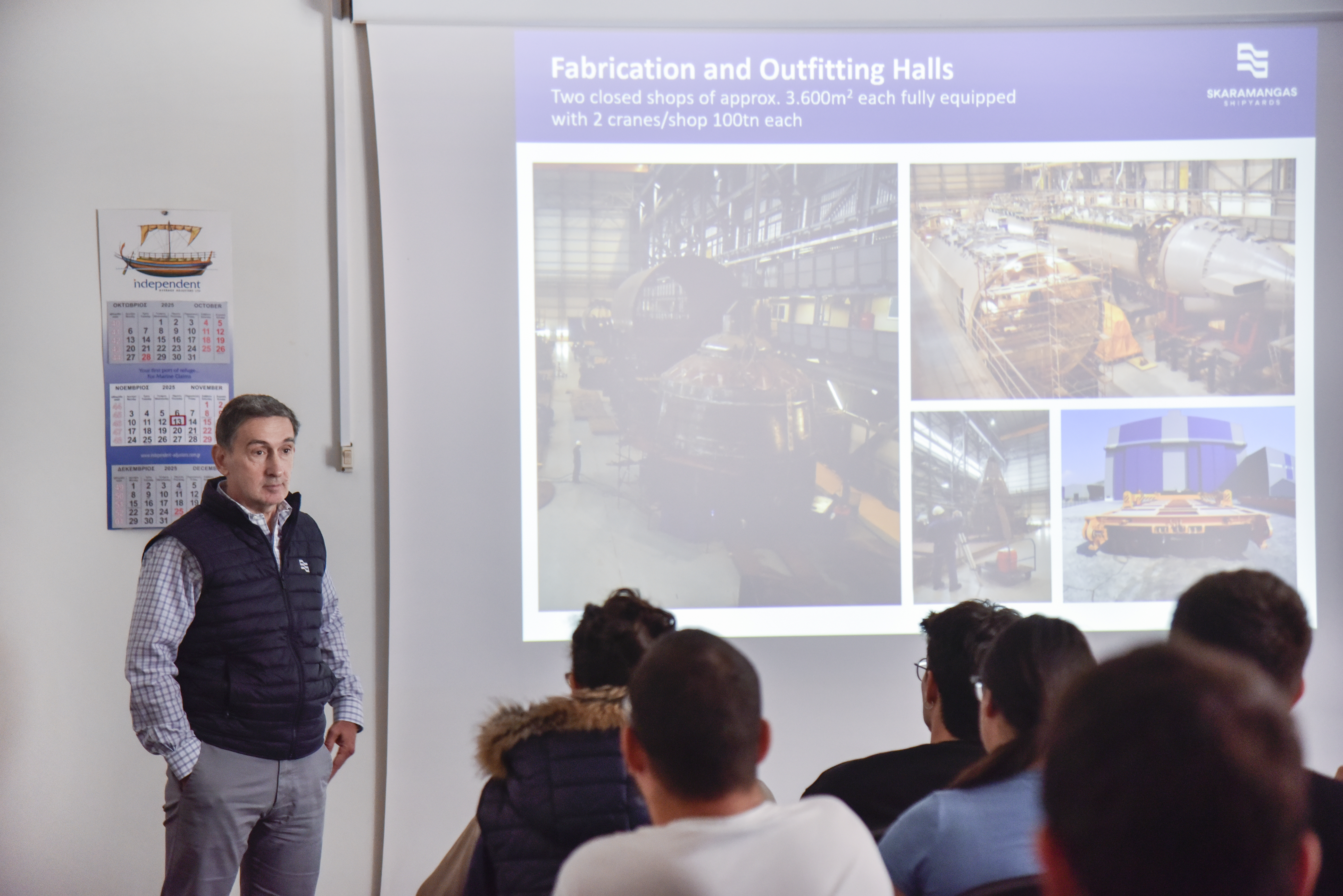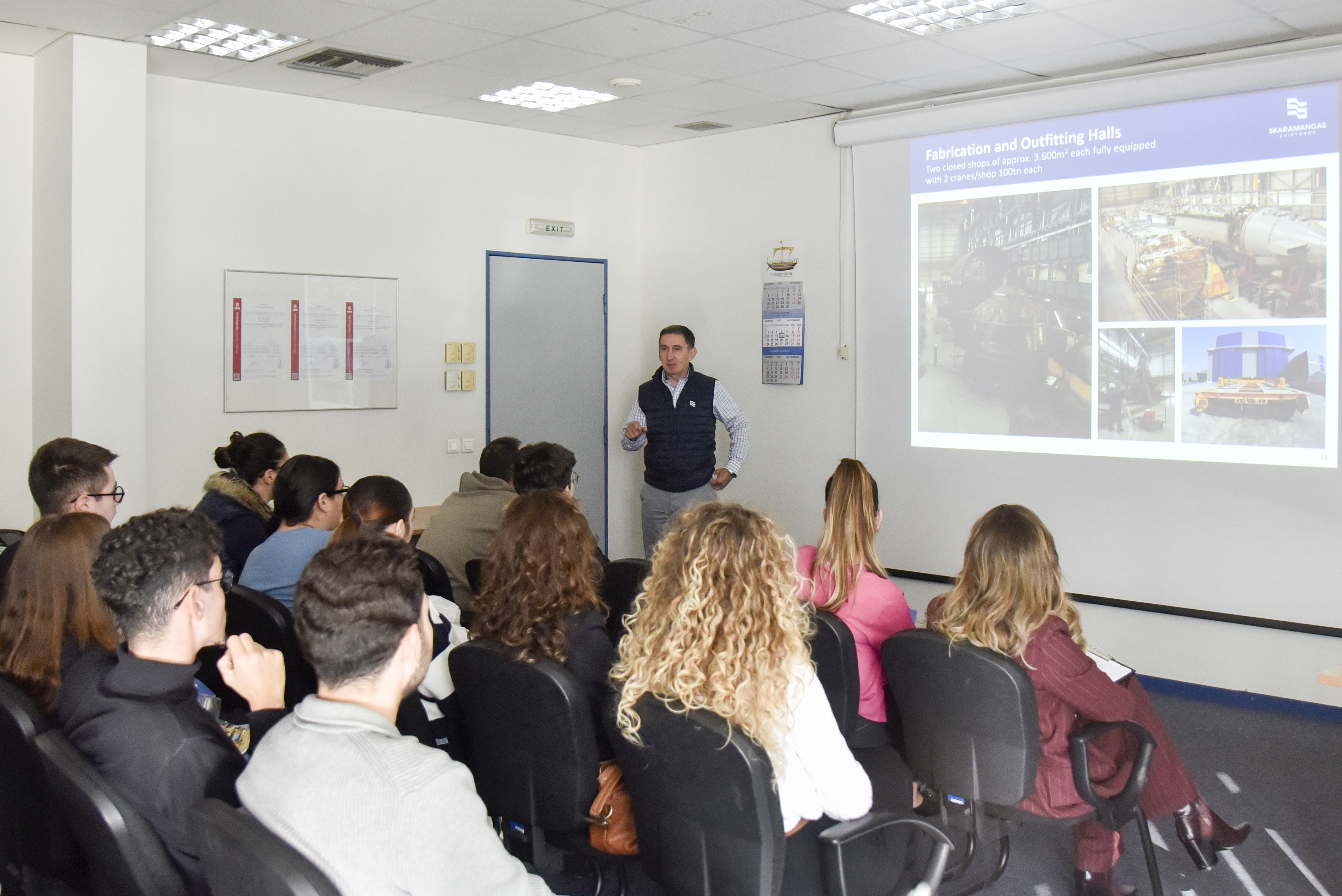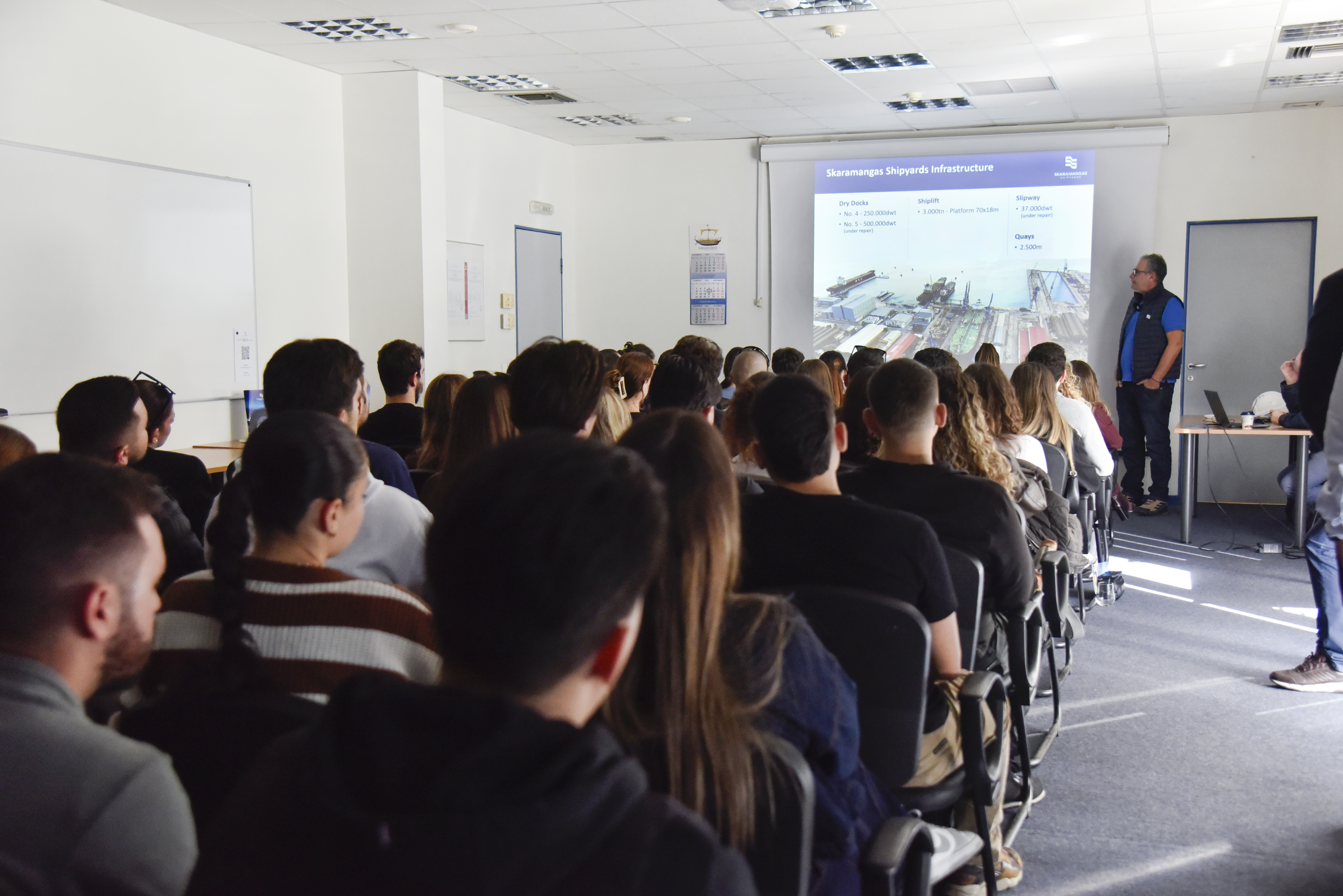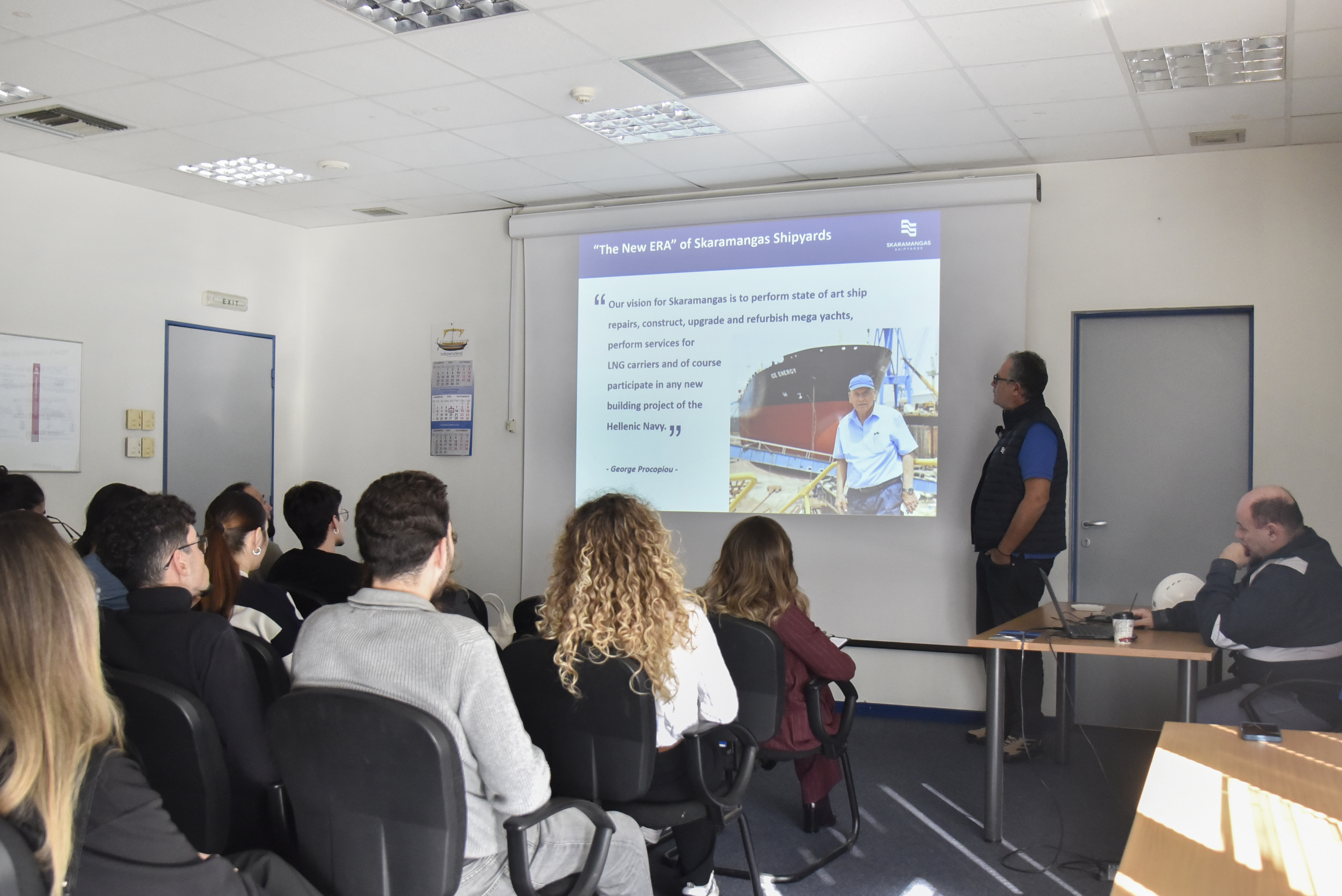 Αξίζει να σημειωθεί ότι, κατά τη διάρκεια της παρουσίασης, την οποία ανέλαβε ο Quality Director, κ. Δημήτρης Στεργιόπουλος, με τη συνεργασία του Shipbuilding Production Manager, κ. Ιωακείμ (Κίμωνα) Κανταρτζή, έγινε αναφορά σε ορισμένα από τα σημαντικότερα ορόσημα του ναυπηγείου στην πορεία των 68 ετών από την έναρξη λειτουργίας του. Παρουσιάστηκαν επίσης διεξοδικά οι διάφορες λειτουργίες και οι δυνατότητες του ναυπηγείου, όπως και ο εξοπλισμός του, σε δεξαμενές και μηχανουργεία, που του προσδίδουν συγκριτικά πλεονεκτήματα στη ναυπηγοεπισκευαστική αγορά της Ανατολικής Μεσογείου.