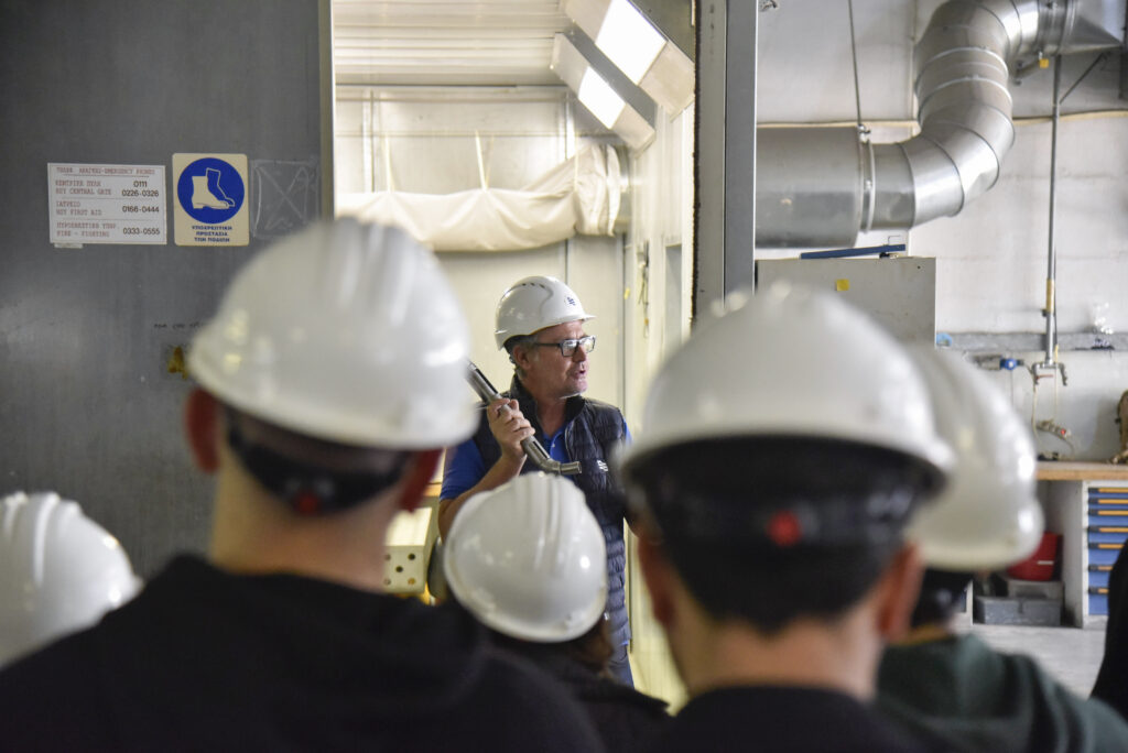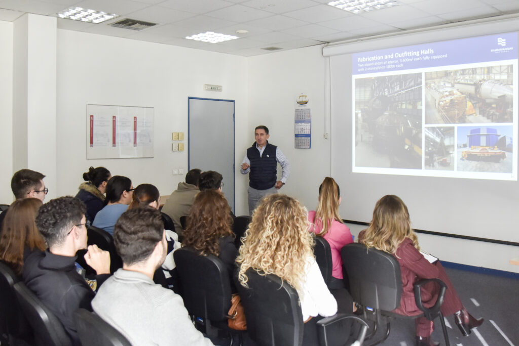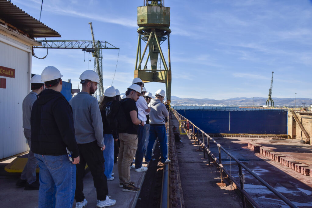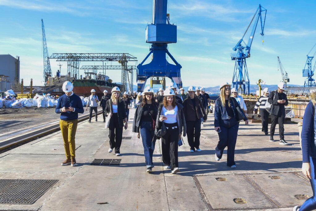Στη συνέχεια, οι συμμετέχοντες στην επιμορφωτική επίσκεψη της Isalos.net φόρεσαν τον απαραίτητο προστατευτικό εξοπλισμό και περιηγήθηκαν στις εγκαταστάσεις των Ναυπηγείων Σκαραμαγκά. Εκεί, o Quality Director των Ναυπηγείων Σκαραμαγκά, κ. Δημήτρης Στεργιόπουλος, ξενάγησε το κοινό της Isalos.net στους βασικούς χώρους εργασίας των ναυπηγείων, με τους νέους και τις νέες να έχουν τη μοναδική ευκαιρία να γνωρίσουν από κοντά τη λειτουργία του μεγαλύτερου ναυπηγείου της χώρας και να κατανοήσουν βασικές εκφάνσεις της ναυπηγοεπισκευαστικής βιομηχανίας στην Ελλάδα.